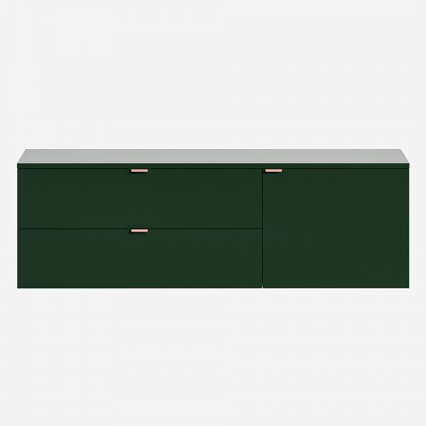 Подвесная тумба с выдвижными ящиками и секциями с полками буквально парит в